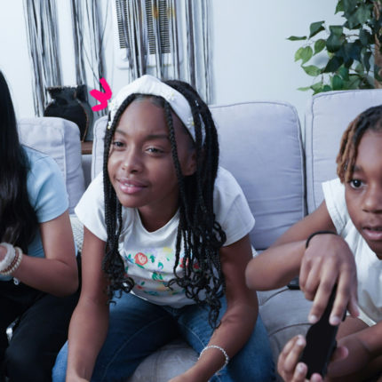 Aplicativos de contação de histórias: Uma mulher e um menino, ambos de pele negra, estão assistindo a algo no tablet e rindo